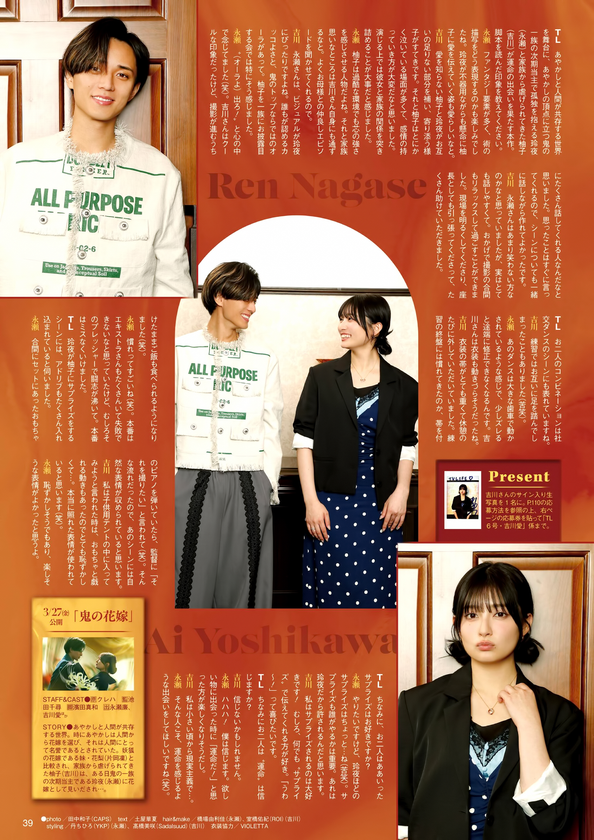 실사 영화 '오니의 신부'(3월 27일 개봉) 주연을 맡은 킹앤프린스 나가세 렌과 요시카와 아이가 함께 등장한